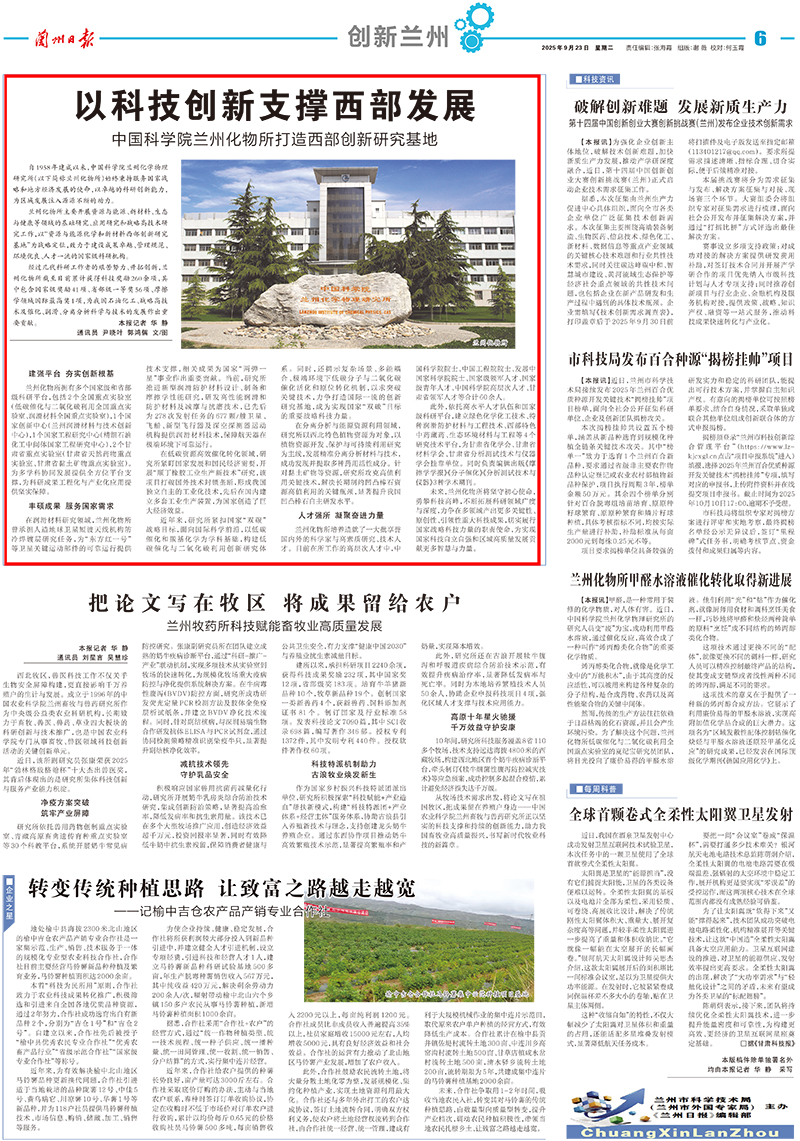 【蘭州日報(bào)】以科技創(chuàng)新支撐西部發(fā)展?中國科學(xué)院蘭州化物所打造西部創(chuàng)新研究基地