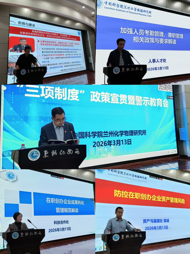 為進(jìn)一步加強(qiáng)科研項(xiàng)目申報(bào)管理、人員兼職管理和崗位管理等“三項(xiàng)制度”的執(zhí)行和有效監(jiān)管,3月13日,中國(guó)科學(xué)院蘭州化學(xué)物理研究所舉辦“三項(xiàng)制度”政策宣貫暨警示教育會(huì)。