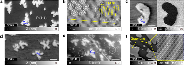 圖2. nc-AFM表征Pt(111)上C60島的熱演化。
