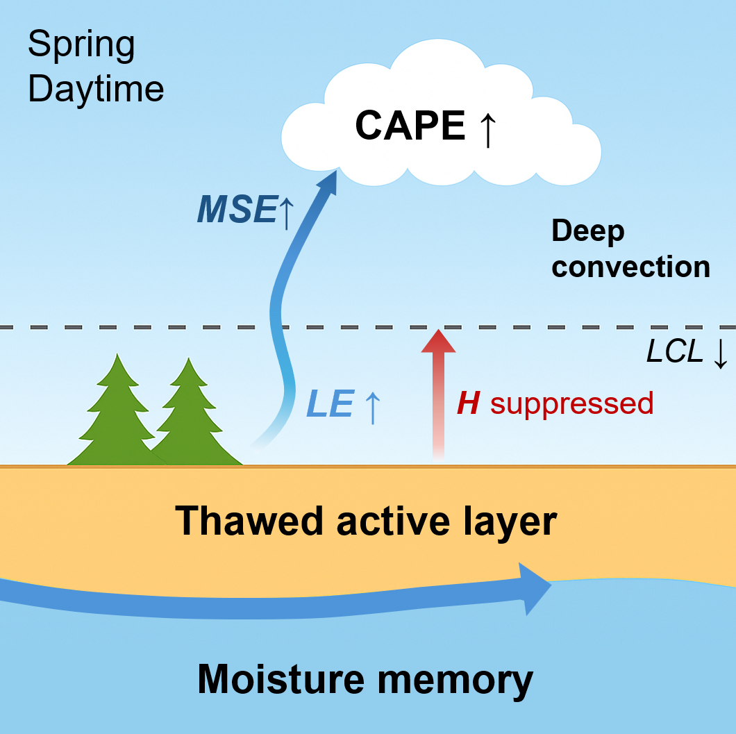 研究團隊依托長期野外觀測、遙感反演和過程模擬,完整描繪了“地表能量分配→邊界層演變→季風與行星波響應”的多尺度反饋鏈條。結(jié)果表明,多年凍土的“凍融記憶”,即凍結(jié)或融化狀態(tài)在季節(jié)間延續(xù)并影響后續(xù)熱量與水分過程,并對土壤熱物理特性及潛熱/顯熱分配造成影響,共同決定了能量釋放的節(jié)奏與路徑,進而影響邊界層穩(wěn)定性、對流觸發(fā)和大氣遙相關(guān)結(jié)構(gòu)。