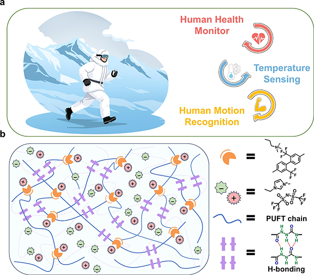 為探索聚氨酯材料的應(yīng)用潛力,基于上述研究,研究人員對聚氨酯材料內(nèi)部分子網(wǎng)絡(luò)設(shè)計和功能化進行深入研究。為實現(xiàn)材料的導電性,引入更多具有額外極性的極性鍵是一種可能的策略,如碳-氟(C-F)鍵。由于F原子的高電負性,C-F鍵的強靜電性質(zhì)會增強進入體系的電子極性,這樣陰離子和陽離子可彼此分布得更遠,在聚合物內(nèi)部移動更自由?;诖耍芯咳藛T提出了一種分子工程范式,利用氟的雙重功能在聚氨酯基質(zhì)中構(gòu)建空間相關(guān)但功能獨立的動態(tài)網(wǎng)絡(luò)。通過引入含氟擴鏈劑和多氫鍵單元,構(gòu)建了氟-陽離子相互作用與高密度氫鍵協(xié)同的動態(tài)網(wǎng)絡(luò),氟的高電負性不僅與封端劑形成離子鍵增強網(wǎng)絡(luò)穩(wěn)定性,還通過偶極相互作用固定陽離子,構(gòu)建陰離子傳輸通道,保障離子高效遷移。從而成功制備了一種具備超敏感多參數(shù)監(jiān)測功能,可用于極地可穿戴設(shè)備形狀記憶聚氨酯材料。