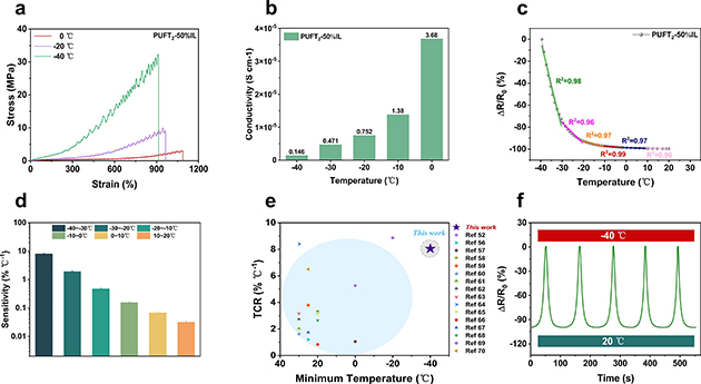 針對極地等極端環(huán)境的挑戰(zhàn),團隊重點測試了材料的低溫耐受性。在-40℃時,材料仍能保持較高的強度、韌性、可拉伸性和離子電導率。此外,該材料表現(xiàn)出負溫度系數(shù)行為,在-40℃至-30℃超低溫區(qū)間的溫度系數(shù)電阻高達8.05% ℃-1,且在連續(xù)熱循環(huán)測試中表現(xiàn)出良好的穩(wěn)定性和可重復性,彰顯了其在深冷環(huán)境下可靠應(yīng)用的潛力。