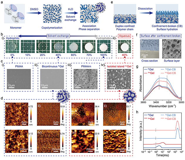 圖2. (a) 通過溶劑交換策略制備結(jié)構(gòu)可調(diào)線性共聚物水凝膠網(wǎng)絡(luò)的示意圖。(b) 不同MAAm含量(摩爾分?jǐn)?shù))水凝膠的宏觀光學(xué)照片。(c) 不同水凝膠的掃描電鏡圖像。(d)BiGel和IsoGel的原子力顯微鏡高度圖與相圖。(e) 表面限域破壞處理形成潤滑層的示意圖。(f)?BiGel-CB截面掃描電鏡圖像,顯示梯度結(jié)構(gòu)。(g)?BiGel、IsoGel及其限域破壞后樣品表面的ATR-FTIR光譜。(h) 不同水凝膠的LF-NMR T?弛豫時間分布。