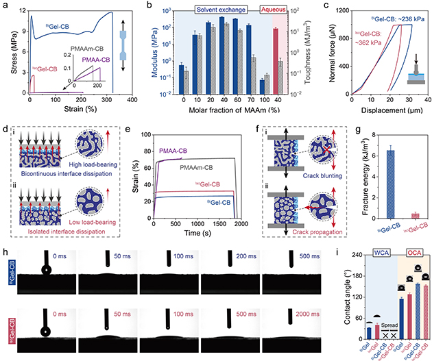 圖3. (a) 不同水凝膠的單軸拉伸應(yīng)力-應(yīng)變曲線。(b) 楊氏模量和韌性與MAAm含量的關(guān)系。(c) 表面納米壓痕測試曲線。(d) 抗蠕變性能測試示意圖及(e)蠕變曲線。(f) 純剪切測試示意圖及(g)斷裂能結(jié)果。(h) 水滴在BiGel-CB和IsoGel-CB表面的動態(tài)鋪展過程。(i)?超親水及水下超疏油性能評估。