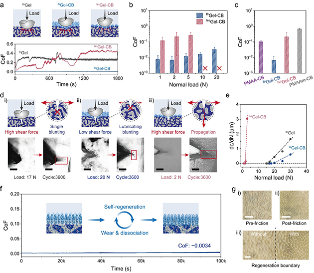 圖5.(a) 摩擦測試示意圖及BiGel、BiGel-CB和IsoGel-CB對應(yīng)的摩擦系數(shù)曲線。(b)?BiGel-CB和IsoGel-CB摩擦系數(shù)隨載荷的變化。(c) PMAA-CB、BiGel-CB、PMAAm-CB和IsoGel-CB樣品的平均摩擦系數(shù)。(d) 摩擦裂紋擴(kuò)展示意圖及 i)?BiGel, ii)?BiGel-CB, iii)?IsoGel-CB的裂紋光學(xué)圖像(比例尺:200 μm)。(e)?BiGel、BiGel-CB和IsoGel-CB的界面裂紋擴(kuò)展速率隨載荷的變化。(f)?BiGel-CB在50 N法向載荷下的長期潤滑性能。(g)?BiGel-CB在PBS溶液中摩擦測試前后的表面光學(xué)圖像:i) 摩擦前,ii) 摩擦后,iii) 摩擦邊界(比例尺:200 μm)。