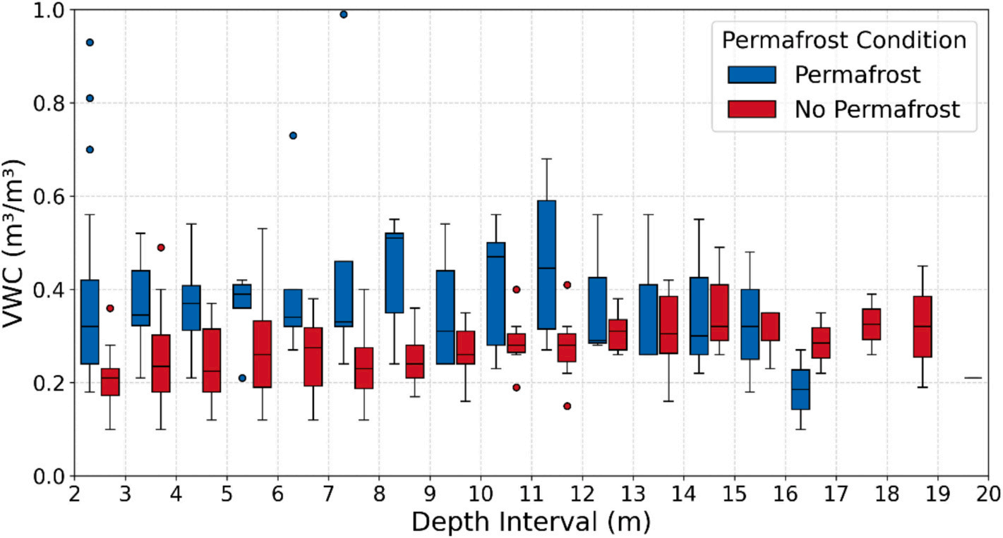 研究團(tuán)隊在根河流域布設(shè)75個淺層土壤剖面和15個深達(dá)20米的鉆孔,獲取了覆蓋森林、草地、濕地等不同下墊面的土壤含水量觀測數(shù)據(jù)。并結(jié)合可解釋機(jī)器學(xué)習(xí)與結(jié)構(gòu)方程模型,系統(tǒng)揭示了邊緣多年凍土區(qū)土壤水分的“垂向分層”特征及其控制機(jī)制。