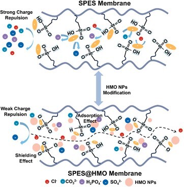 針對上述挑戰(zhàn),中國科學(xué)院青海鹽湖研究所離子吸附科學(xué)與技術(shù)課題組提出了一種氯離子膜“電荷屏蔽效應(yīng)”設(shè)計策略,開發(fā)了一種由磺化聚醚砜(SPES)與水合錳氧化物(HMO)顆粒復(fù)合的新型混合基質(zhì)膜-氯離子吸附膜(SPES@HMO)。該膜利用HMO納米顆粒調(diào)控膜界面電荷環(huán)境,從而特異性增強氯離子的傳輸,同時結(jié)合競爭吸附機制抑制多價陰離子的通過,為高鹽廢水中氯離子的高精度篩分提供了全新解決方案。