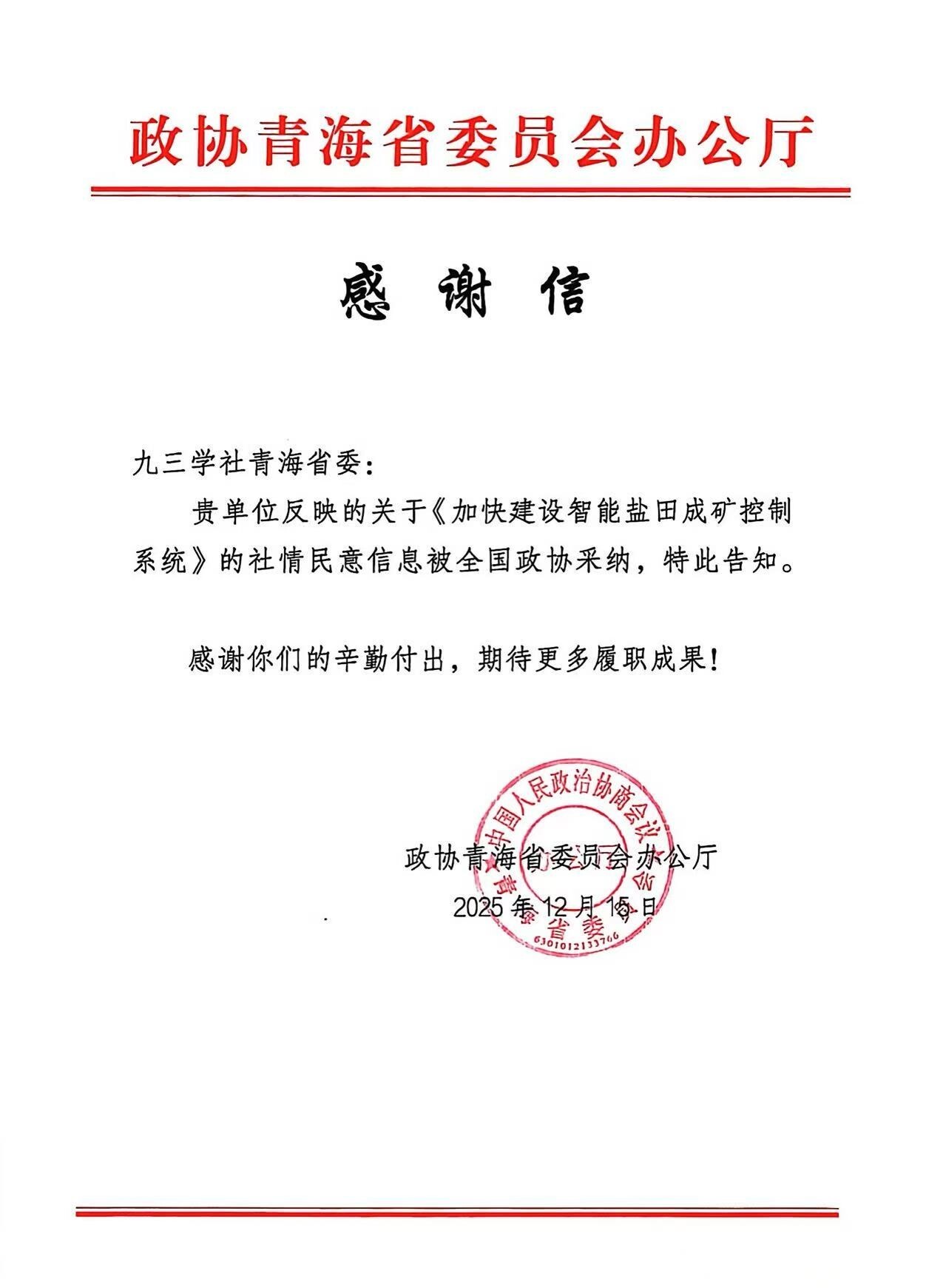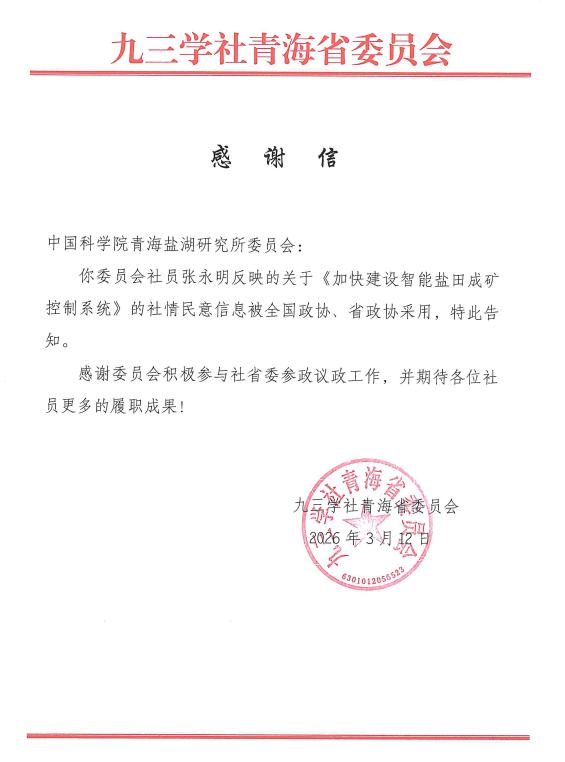 近日,從政協(xié)青海省委員會辦公廳獲悉,九三學(xué)社中國科學(xué)院青海鹽湖研究所委員會社員張永明撰寫的社情民意信息《加快建設(shè)智能鹽田成礦控制系統(tǒng)》,已被全國政協(xié)采納。