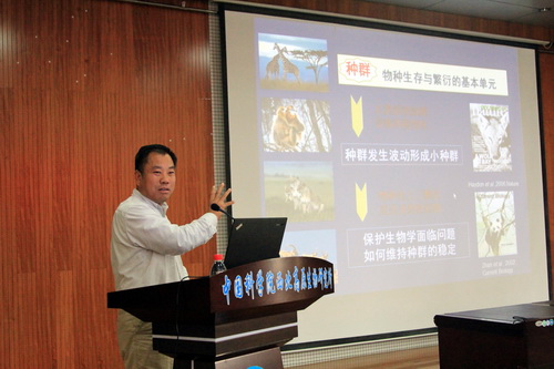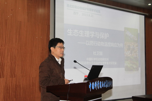 本次論壇共安排11個特邀報告。中國科學院院士、中國科學院水生生物研究所研究員桂建芳,中國科學院動物研究所研究員蔣志剛、王德華、雷富民、杜衛(wèi)國、詹祥江,西北大學教授李保國、中國科學院昆明動物研究所研究員施鵬、東北林業(yè)大學教授張明海、山東大學教授李玉春、西北高原所研究員楊其恩分別作了題為“多倍體銀鯽及其復合種的生態(tài)分布格局與演化歷史”、“未雨綢繆、亡羊補牢:量化中國哺乳動物滅絕風險”、“生理生態(tài)學與動物保護:學科地位與發(fā)展的思考”、“應對第四紀冰期和氣溫變化的鳥類譜系地理學過程”、“生態(tài)生理學與保護:以爬行動物溫度響應為例”、“Reference genome, population genetics and population genomics of wild falcons”、“環(huán)境變化下的秦嶺金絲猴社群結構”、“基因組時代下的生物多樣性資源挖掘”、“基于糞便分子生物學及3S技術的馬鹿家域研究”、“我國小型哺乳動物物種多樣性的低估與保護迫切性”和“配子體外生產技術在畜牧生產和野生動物保護中的應用潛力和挑戰(zhàn)”的報告。精彩絕倫的報告引起了與會代表的極大興趣,大家認真傾聽、踴躍發(fā)言,展開了熱烈的交流與討論,現(xiàn)場氣氛異?;钴S。