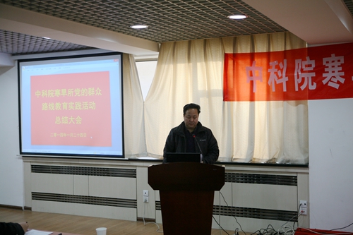 之后,寒旱所黨委書記、副所長(zhǎng)呂世華作了寒旱所黨的群眾路線教育實(shí)踐活動(dòng)總結(jié)報(bào)告。呂世華介紹了寒旱所群眾路線教育實(shí)踐活動(dòng)基本情況、主要做法、取得成效。寒旱所教育實(shí)踐活動(dòng)自2013年7月全面啟動(dòng)以來,所黨委認(rèn)真深入學(xué)習(xí)中央和中科院的精神,按照中央“照鏡子、正衣冠、洗洗澡、治治病”的黨的群眾路線教育實(shí)踐活動(dòng)的總體要求,圍繞中央八項(xiàng)規(guī)定、院“12項(xiàng)要求”和反對(duì)“四風(fēng)”精神,通過學(xué)習(xí)教育、聽取意見,查擺問題、開展批評(píng),整改落實(shí)、建章立制環(huán)節(jié),結(jié)合研究所的工作實(shí)際, 扎實(shí)、有序、高質(zhì)量地推進(jìn)了黨的群眾路線教育實(shí)踐活動(dòng)。通過教育實(shí)踐活動(dòng),進(jìn)一步堅(jiān)定了理想信念、明確了創(chuàng)新責(zé)任,堅(jiān)定了“創(chuàng)新為民”宗旨,進(jìn)一步促進(jìn)了作風(fēng)轉(zhuǎn)變、提升服務(wù)能力,強(qiáng)化了“務(wù)實(shí)求真”作風(fēng),進(jìn)一步加強(qiáng)了科研管理和廉潔從業(yè)風(fēng)險(xiǎn)防控體系建設(shè),強(qiáng)化了制度建設(shè),初步形成踐行黨的群眾路線的長(zhǎng)效機(jī)制